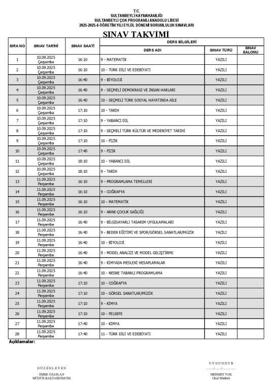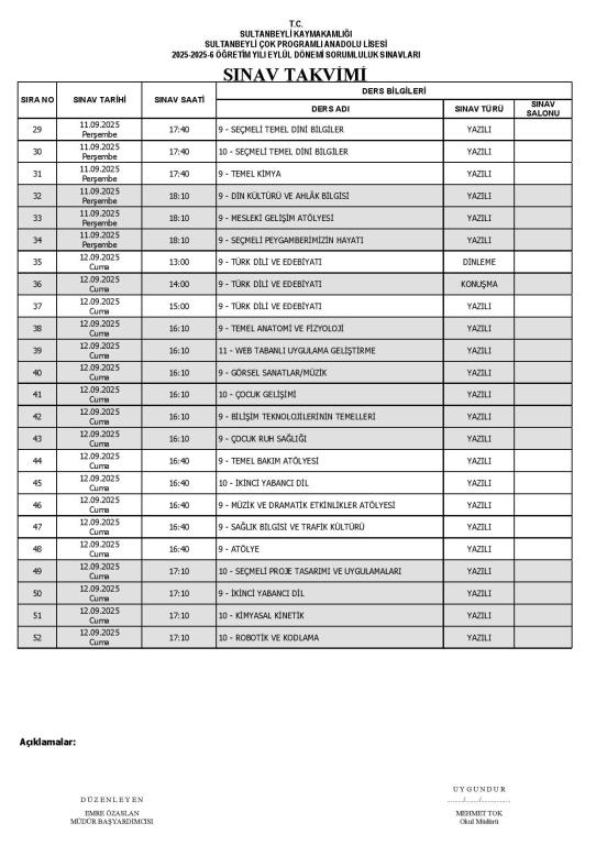 08.09.2025 Tarihinden İtibaren Geçerli Ders Programı